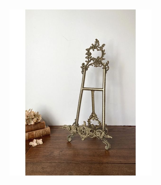 A compact and elegant brass easel, perfect for showcasing plates, photo frames, or artwork.