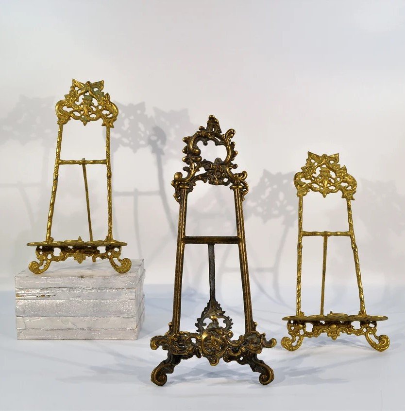 A compact and elegant brass easel, perfect for showcasing plates, photo frames, or artwork.