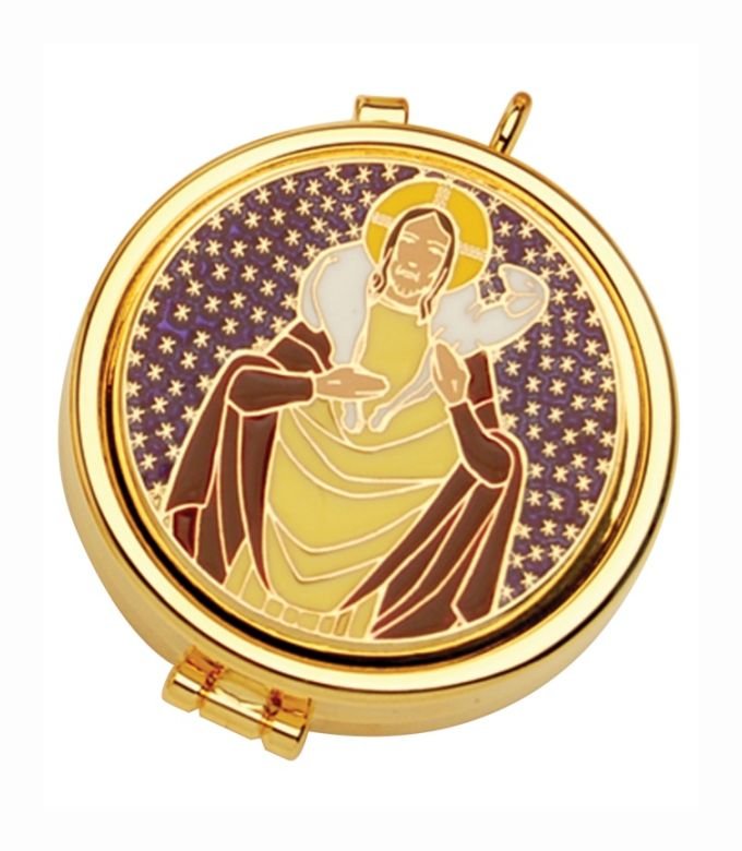 This polished round brass pyx features a raised IHS emblem on the lid, symbolizing the Holy Name of Jesus. Traditionally used to carry the consecrated Eucharist to the sick or homebound, it’s ideal for priests, Eucharistic ministers, and church use.