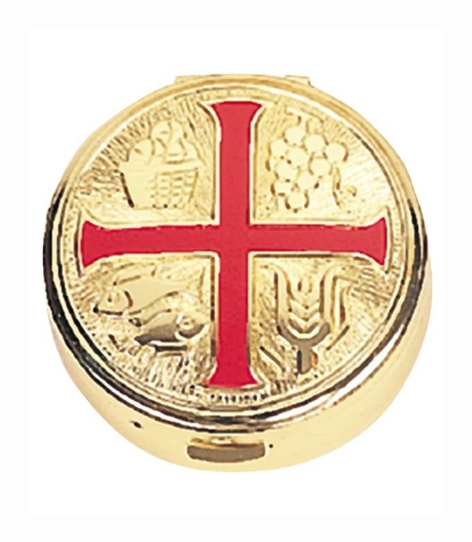 This polished round brass pyx features a raised IHS emblem on the lid, symbolizing the Holy Name of Jesus. Traditionally used to carry the consecrated Eucharist to the sick or homebound, it’s ideal for priests, Eucharistic ministers, and church use.