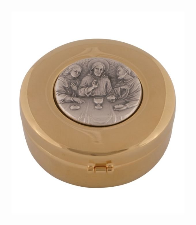 This polished round brass pyx features a raised IHS emblem on the lid, symbolizing the Holy Name of Jesus. Traditionally used to carry the consecrated Eucharist to the sick or homebound, it’s ideal for priests, Eucharistic ministers, and church use.