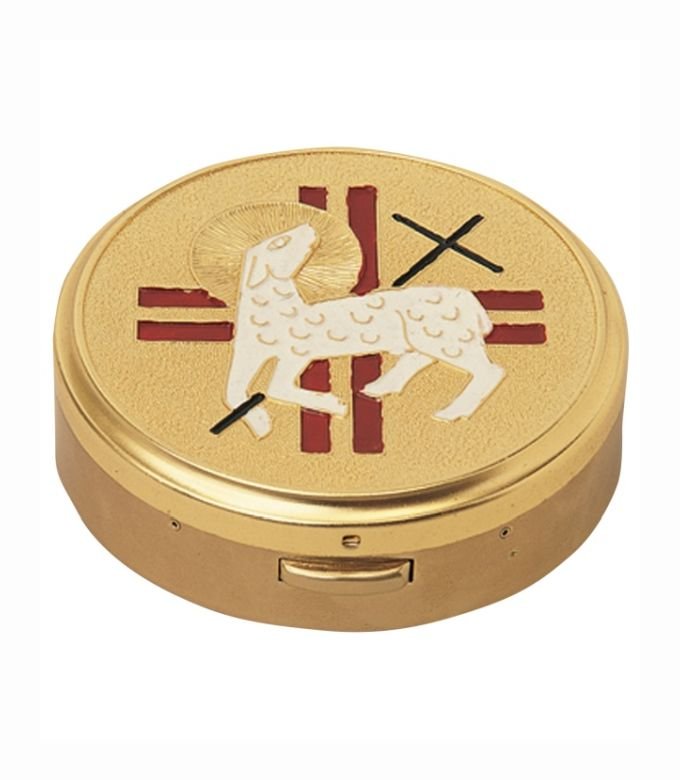 This polished round brass pyx features a raised IHS emblem on the lid, symbolizing the Holy Name of Jesus. Traditionally used to carry the consecrated Eucharist to the sick or homebound, it’s ideal for priests, Eucharistic ministers, and church use.