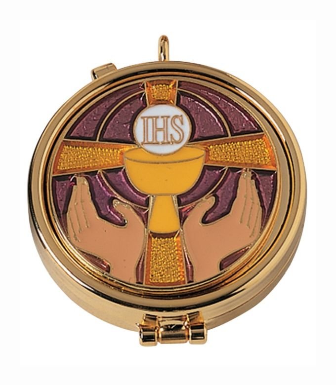 This polished round brass pyx features a raised IHS emblem on the lid, symbolizing the Holy Name of Jesus. Traditionally used to carry the consecrated Eucharist to the sick or homebound, it’s ideal for priests, Eucharistic ministers, and church use.